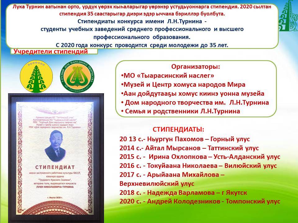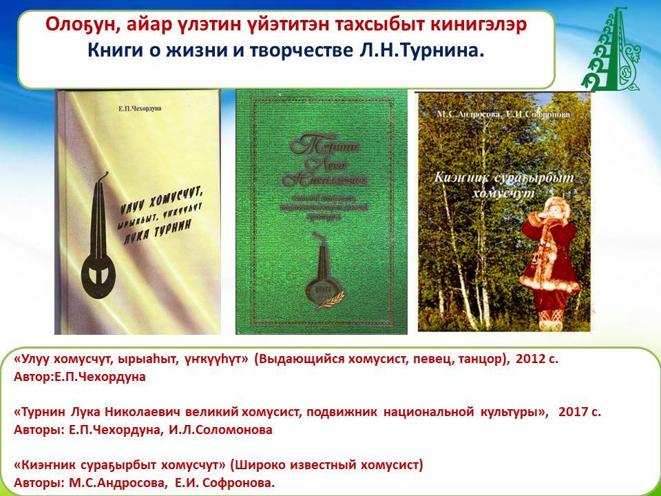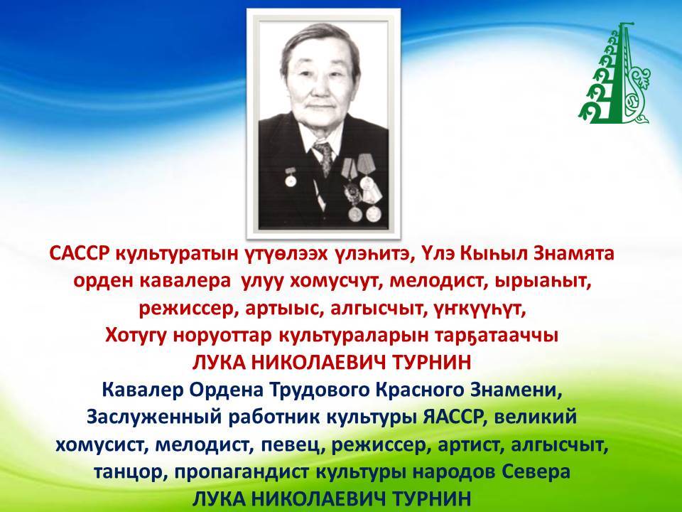 Мин саха норуотун фольклорнай айымньыта, музыкальнай култуурата кэнэҕэһин кэнэҕэс Бүтүн Сойуус айар түһүлгэтигэр таһаарыллан, аан дойдуга киэҥник тарҕаныа, ыччат дьон төрөөбүт норуотун тылынан уус-уран айымньыларын өссө дириҥник үөрэтиэ, саха норуотун култууратын пааматынньыктара саҥаттан саҥа, урут биллибэтэх-көстүбэтэх айымньыларынан туолуо диэн дириҥник эрэнэбин”, — диэн хомуһуннаах хомусчут бүгүҥҥү күнү өтө көрбүттүү кэриэһин этэн хаалларбыт эбит Лука Николаевич Турнин